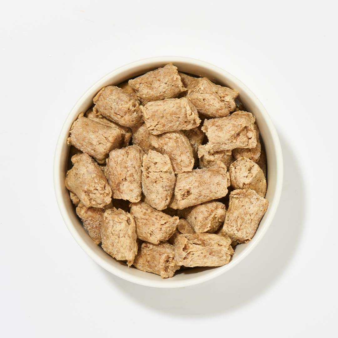 Die Basis unserer Köttbullar sind Rinderpansen, fleischiger Hühnerrücken und Lachs. Ergänzt mit Hühnerleber, frischem Gemüse und Ei ergibt sich eine schmackhafte und vollwertige Ration für deinen Hund. Um die Nährstoffversorgung abzusichern, geben wir noch Seealgen, Leinöl und etwas Vitamine und Mineralien hinzu. Durch die einzeln gefrorenen Bällchen ist dieses Komplettmenü leicht zu portionieren. Entnimm einfach die benötigte Menge und lasse nur diese auftauen. Der Rest kann im wiederverschließbaren Beutel sofort wieder im Tiefkühlschrank verstaut werden. Auch nach dem Antauen einer größeren Menge im Kühlschrank sind die Köttbullar immer noch einzeln portionierbar.